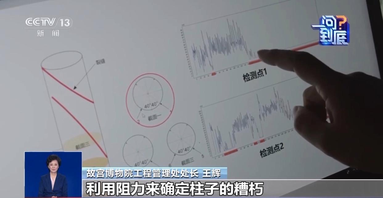 故宫博物院工程管理处处长 王辉:利用阻力来确定柱子的糟朽,打的孔不超过两毫米,微乎其微。柱子上部感觉还不错,打完箍之后还能够使用,我们就对它进行了高位墩接,建筑整体的更换率不是太大。