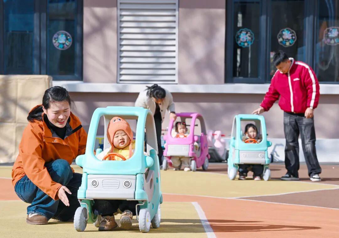 1月8日,在江苏宿迁经开区小青鸟托育园,小朋友们在老师的陪伴下玩游戏。朱峰摄