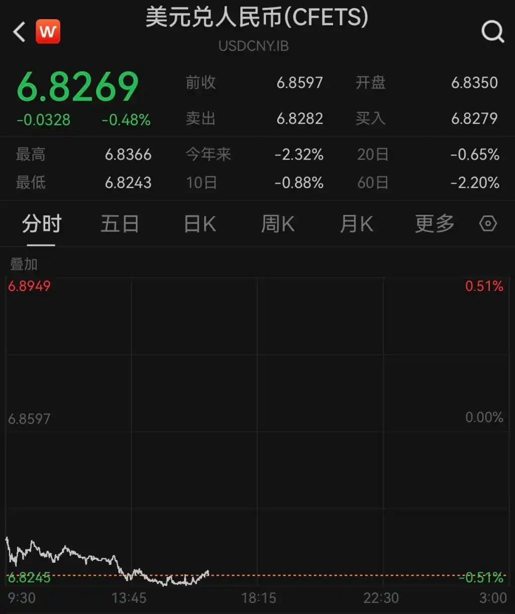 4月8日,人民币对美元即期汇率盘中最高升至6.8243,较前一交易日收盘价6.8597大涨超350点,16时30分日盘报6.8274,较上一交易日上涨323点,创下2023年2月15日以来新高。